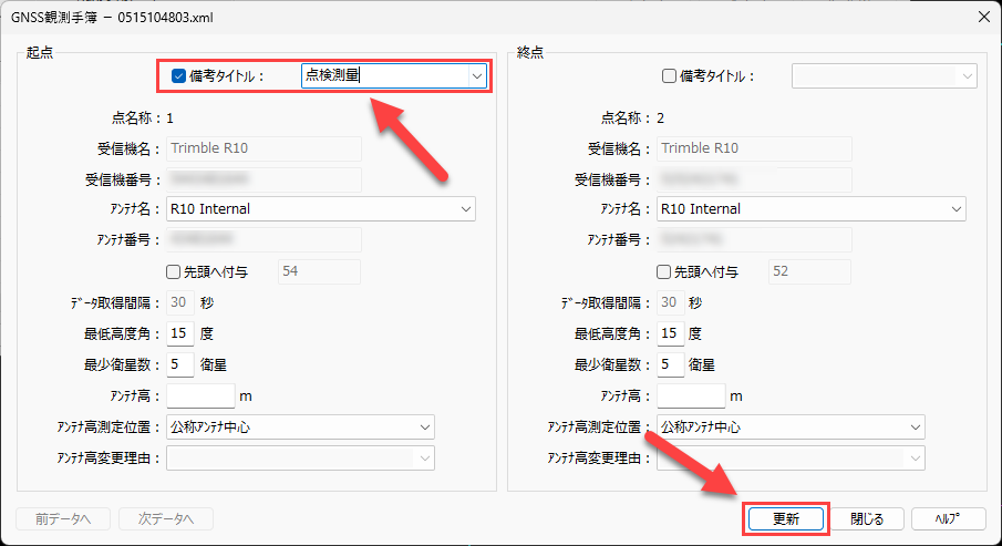2.【備考タイトル】にチェックを付け【点検測量】を入力し、【更新】をクリックします