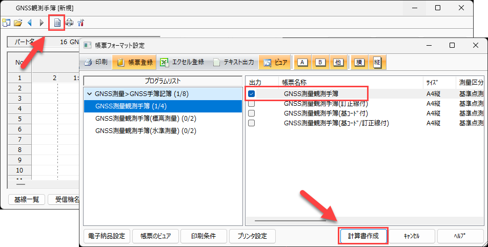 3.【計算書出力】から【GNSS測量観測記簿】を選択し【計算書作成】をクリックし計算書を出力します
