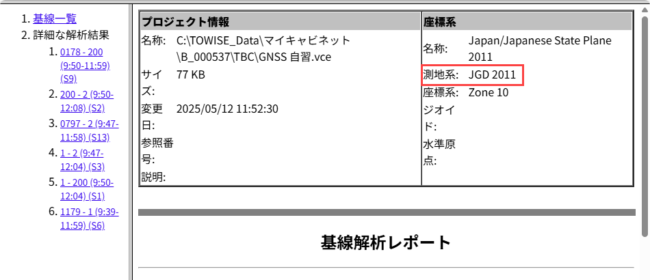 TBC-JSLで基線解析をした後の詳細情報に「測地系:JGD2000」もしくは「測地系:JGD2011」と書かれております。