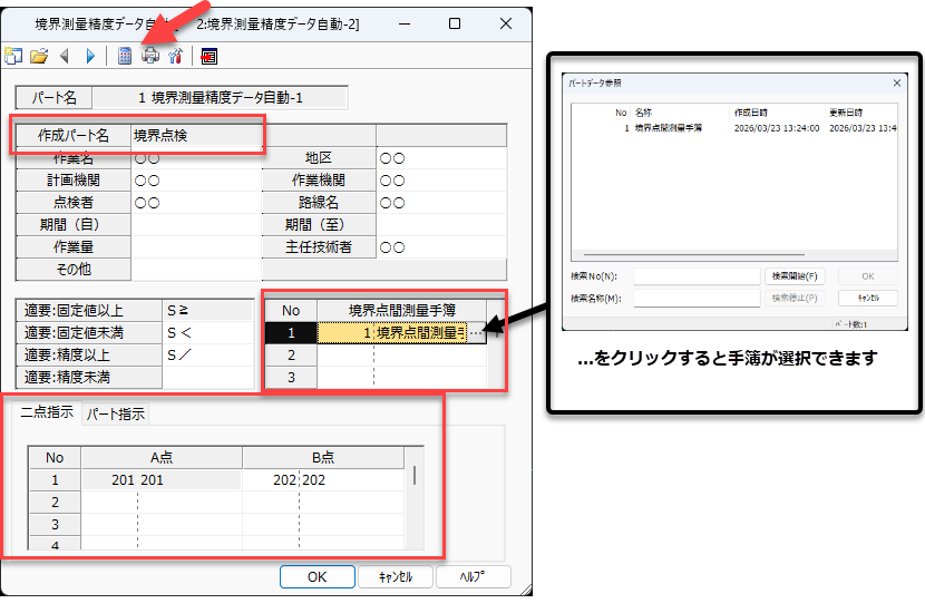 作成パート名/境界点間測量手簿/二点指示orパート指示